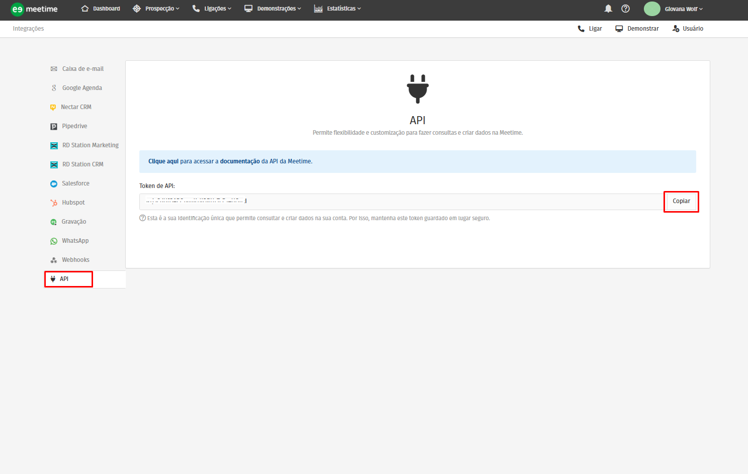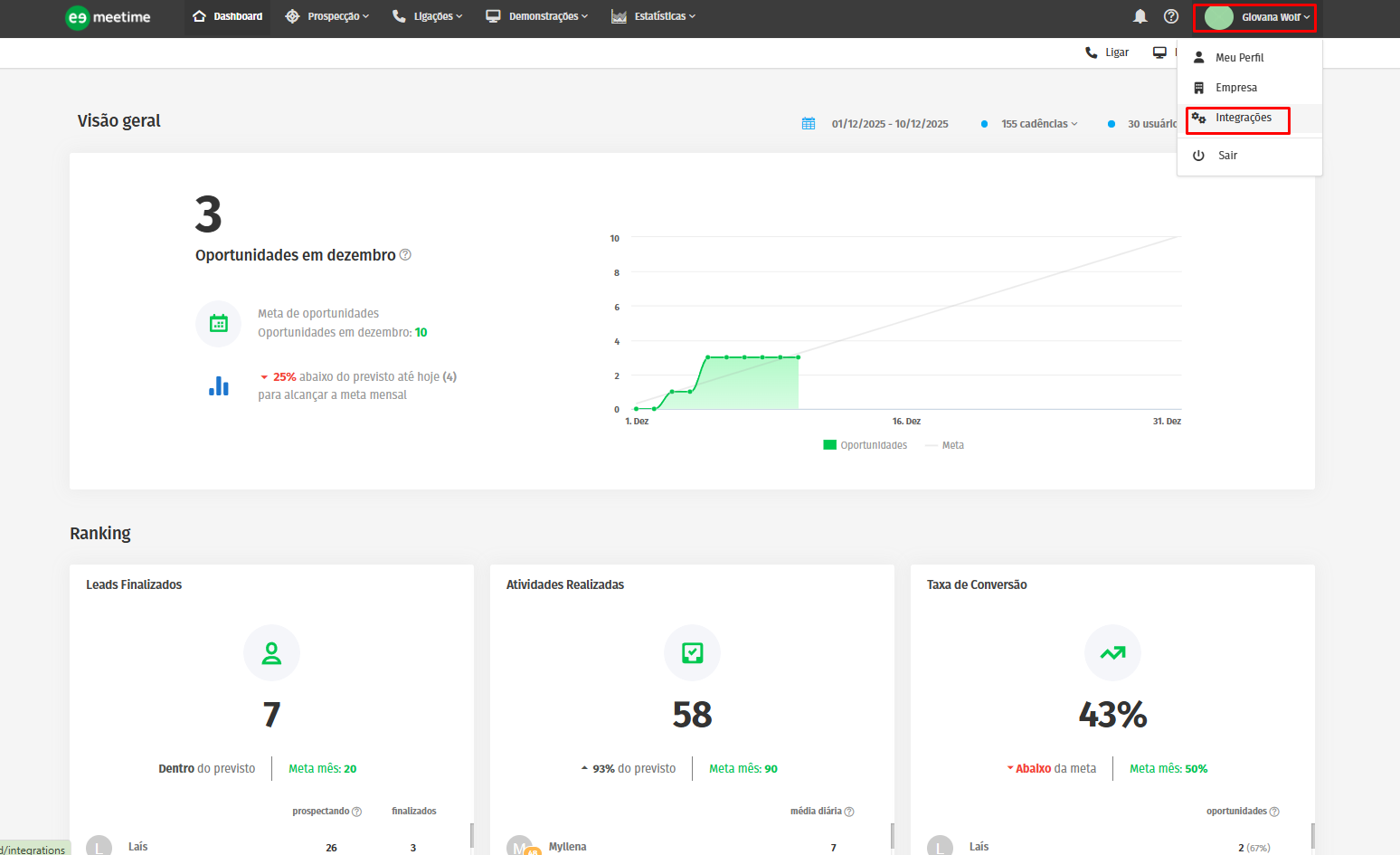 Para isso, basta clicar no seu nome no canto superior direito da tela > Integrações