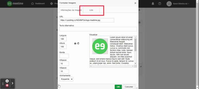 É possível ainda transformar essa imagem em um link clicável, caso queira direcionar para o site da empresa, para isso é necessário acessar a aba link > adicionar o link para o direcionamento > selecionar o destino do link (se deve abrir uma nova janela, por exemplo) e clicar em Ok.