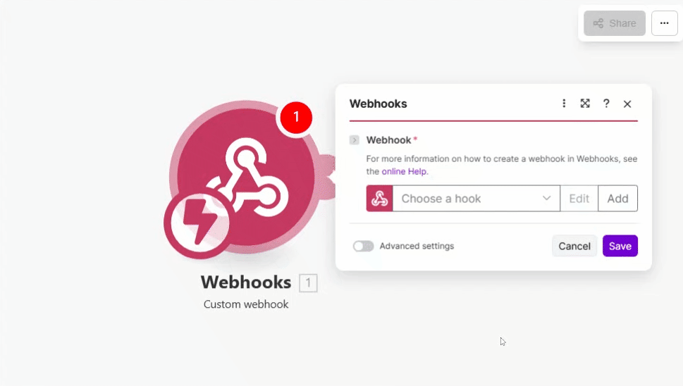 - Selecione o “Evento” conforme a integração que você deseja construir no Make (quais dados o outro sistema deve receber)