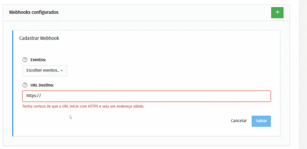 - Clique aqui > botão verde de “+” para adicionar um Webhook