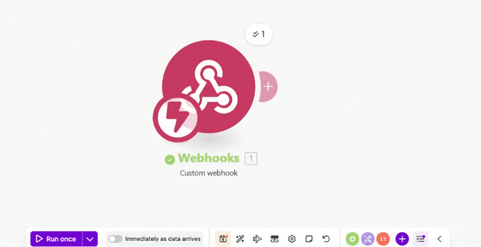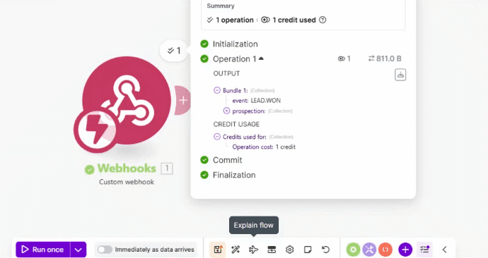 Depois desses passos, de volta no Make, clique em “Run once” no rodapé da página para testar o recebimento dos dados: