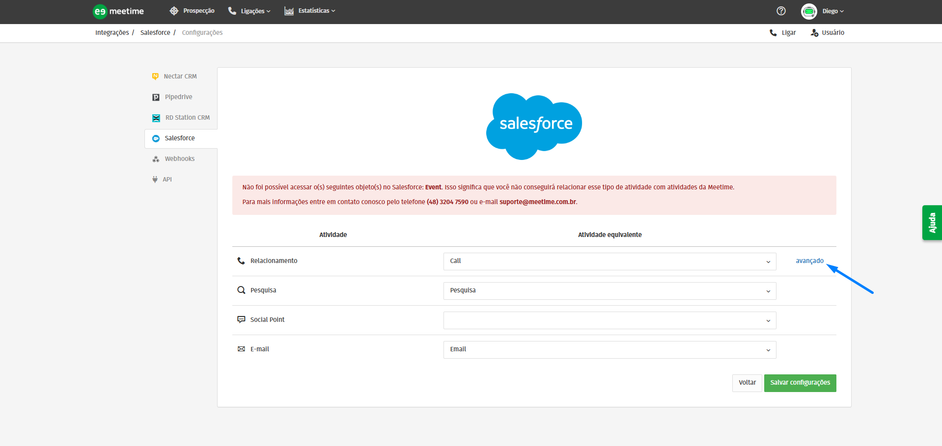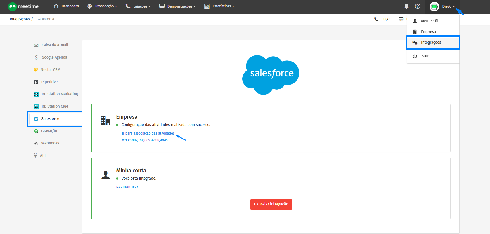 Integrar na Meetime: Acesse sua conta da Meetime, clique na setinha ao lado do nome do usuário > vá em Integrações > Salesforce > e clique em Integrar.