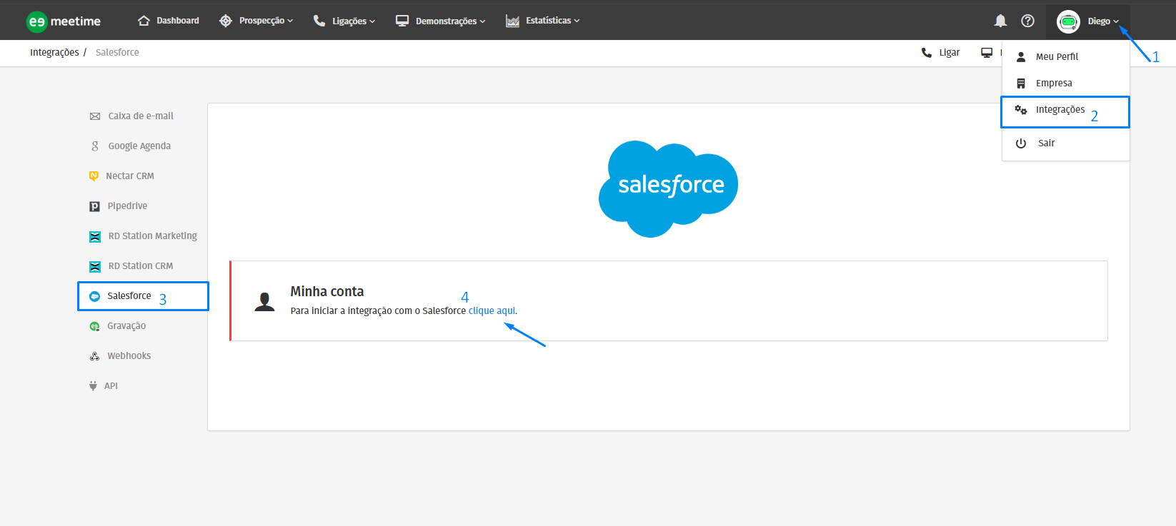 Integrar na Meetime: Acesse sua conta da Meetime, clique na setinha ao lado do nome do usuário > vá em Integrações > Salesforce > e clique em Integrar.