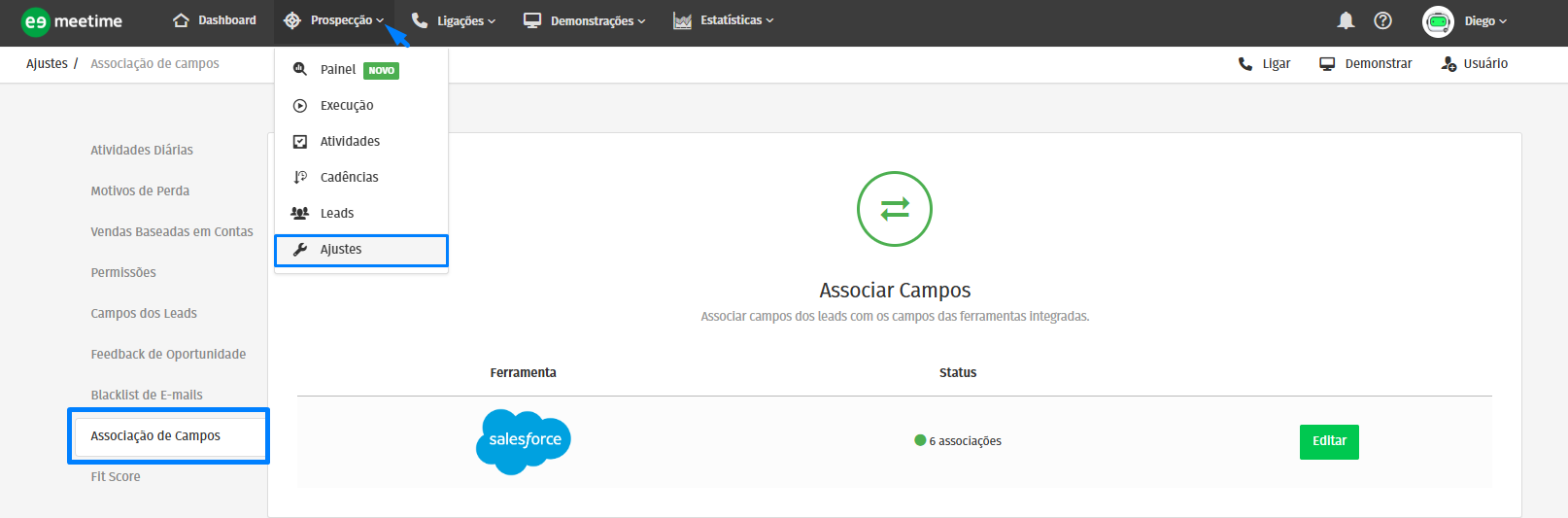 Associar campos: Faça a associação dos campos acessando: Prospecção → Ajustes → Associação de Campos → Editar.