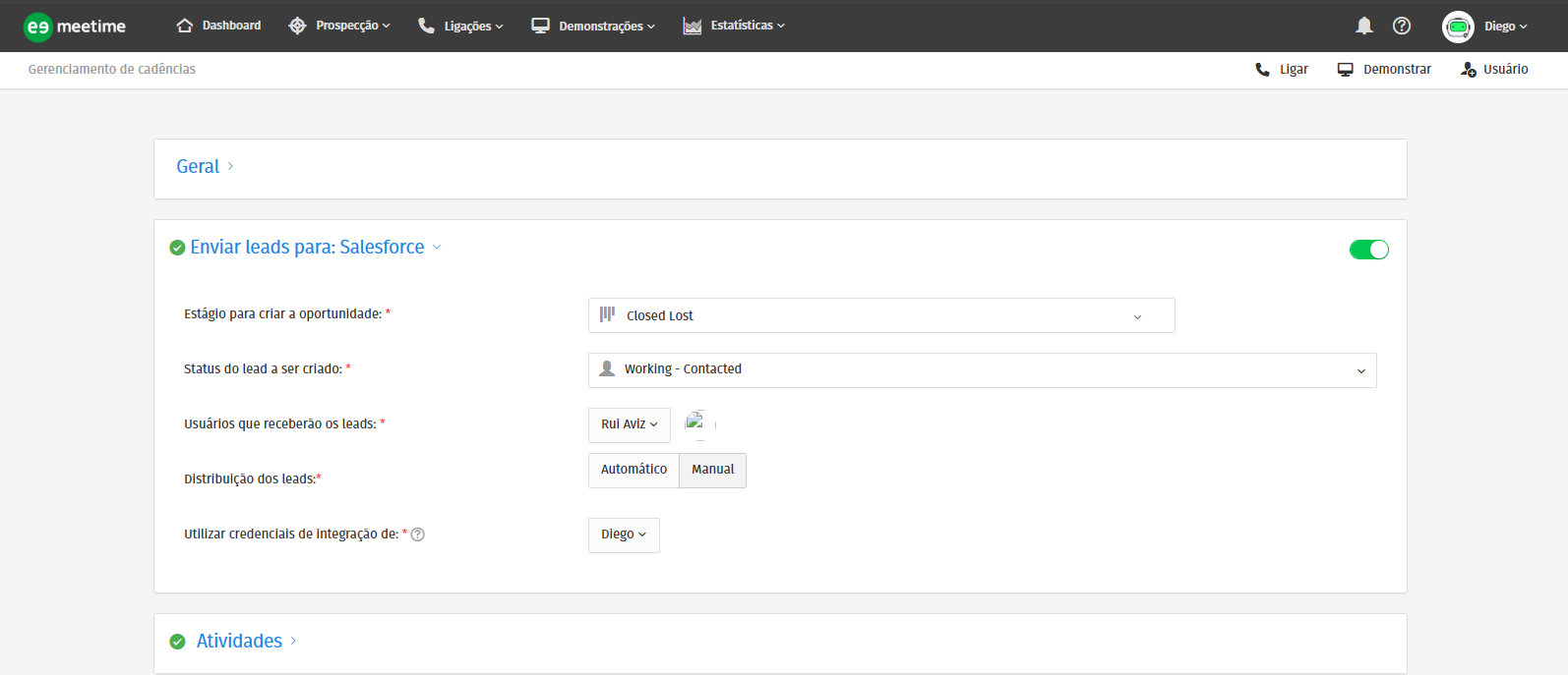 Configurar a cadência: Para enviar automaticamente os leads ganhos ao Salesforce, ative a Configuração de saída dentro de cada cadência: Meetime → Prospecção → Cadências → Editar cadência → Enviar leads para: Salesforce.