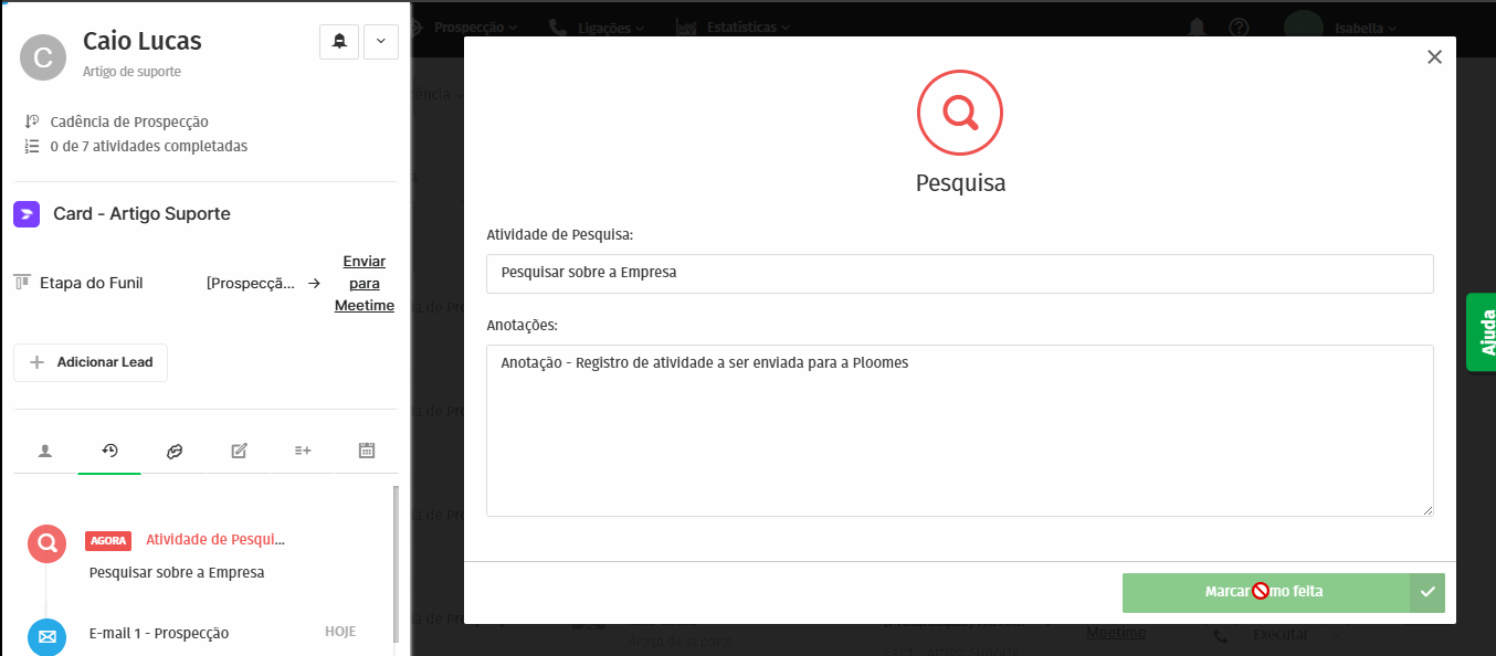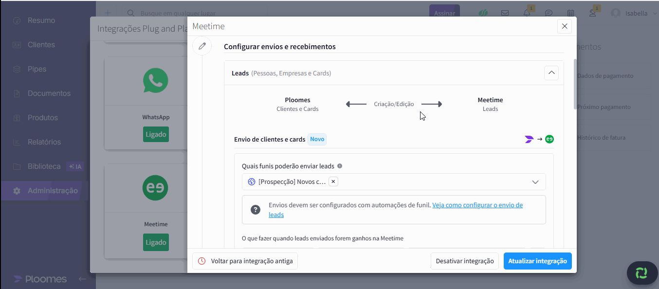 Após concluir a nova integração entre Ploomes e Meetime, o fluxo já está pronto para uso.