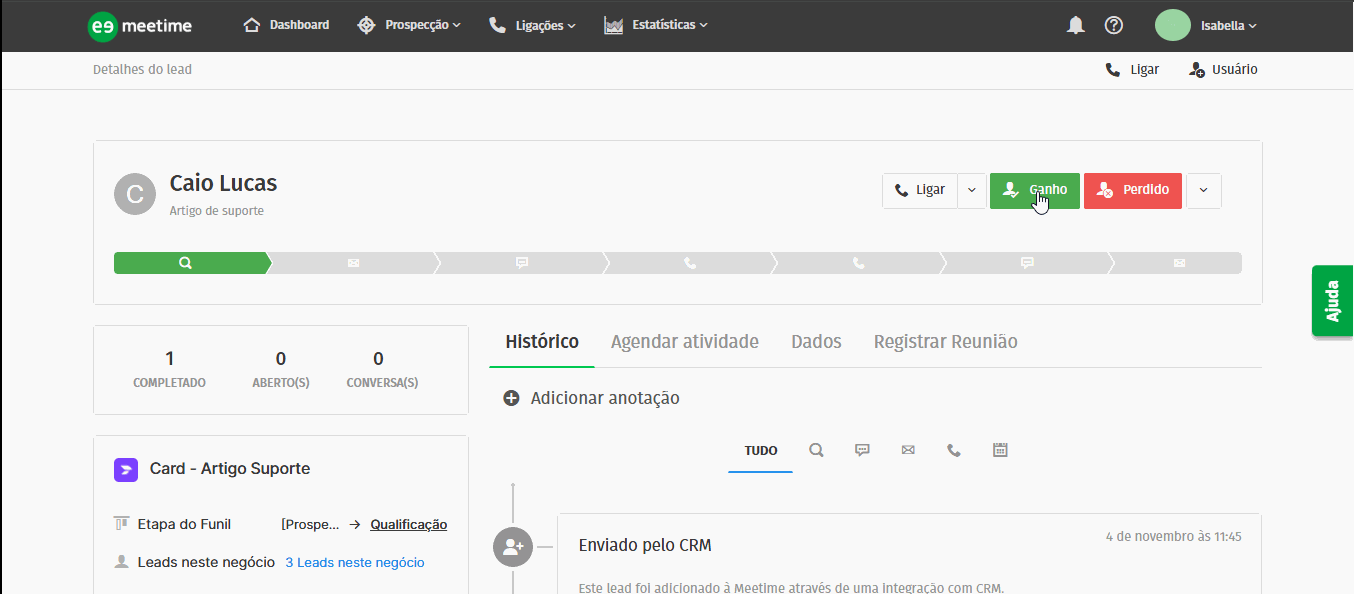 Registro de Interação: Registro automático criado no histórico do card conforme as atividades executadas na Meetime (ex.: ligação, e-mail, reunião).